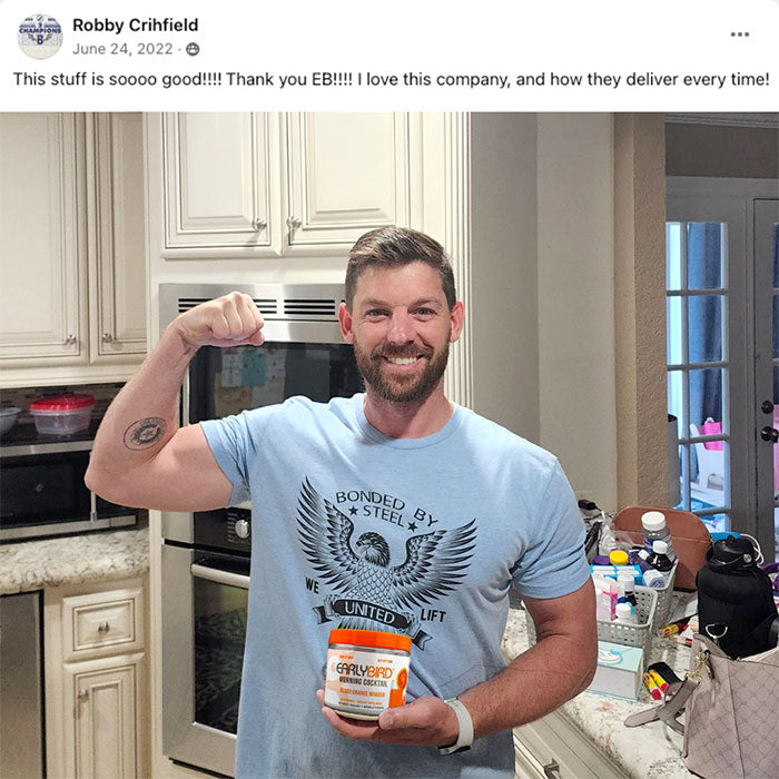 Hello, my name is Jeremy. I work about 55 hours a week managing a very busy automotive shop. I had been living on 2 monsters a day until I found EarlyBird. This all natural boost truly gives you "Kick Ass Energy" all day!